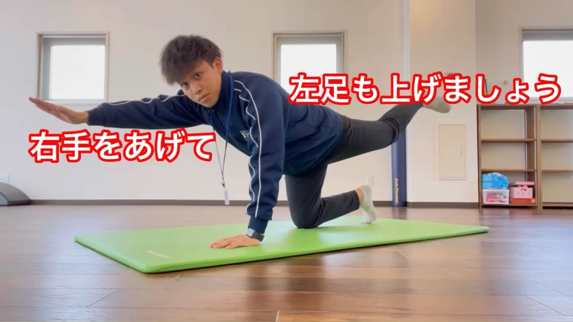 このエクササイズは、四つ這いの状態から手足を交互に上げてキープする動作を繰り返すことで、体幹の安定性やバランス能力を高めるトレーニングです。姿勢改善にもつながり、スポーツのパフォーマンス向上にも効果的です!